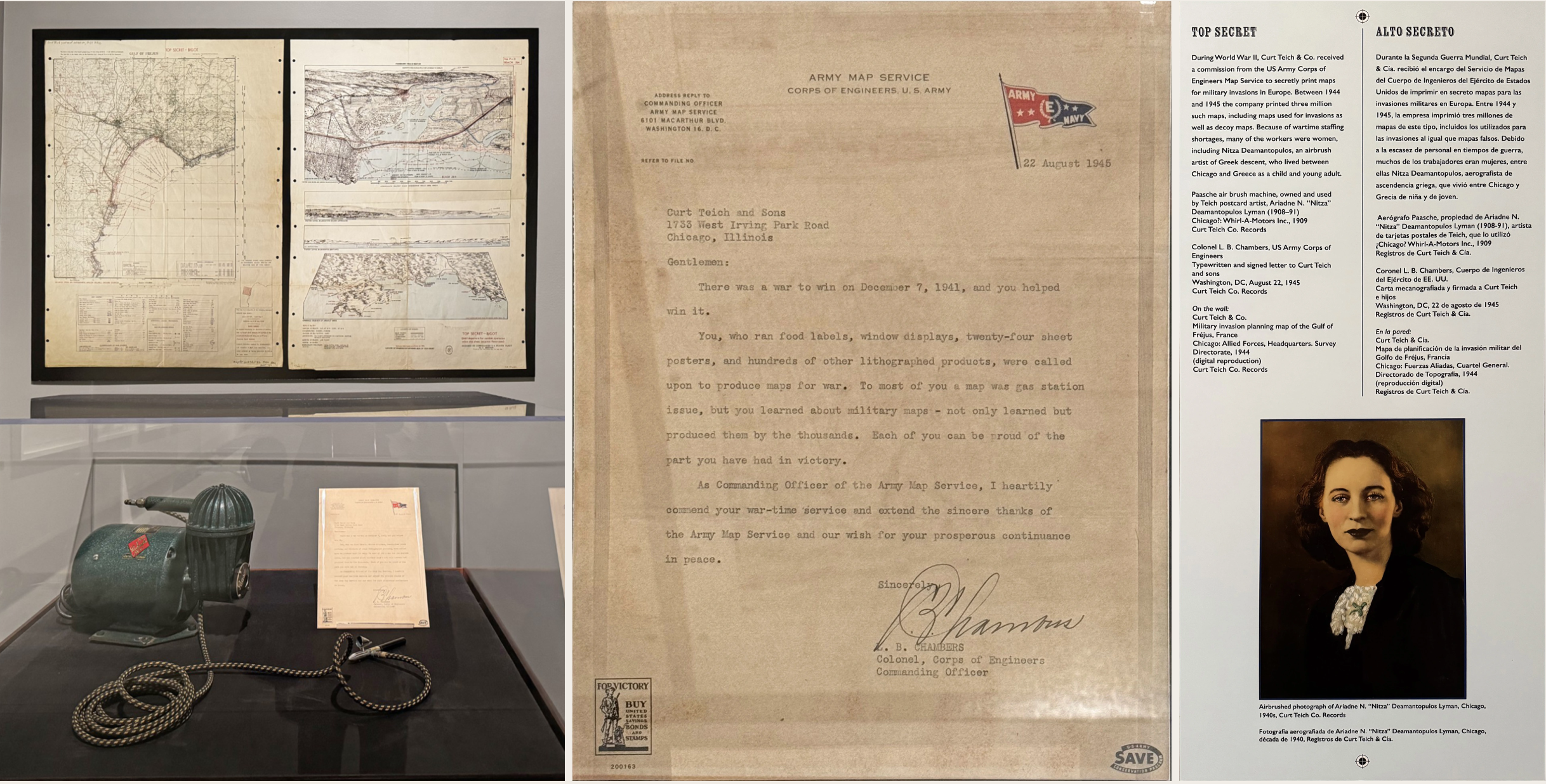 Curt Teich was one of the largest postcard printers in the world, primarily producing images of American life. During World War II, the company was also involved in printing over three million maps for the War Map Department. With men drafted into service, women artists like Nitza were hired to assist with production – and were bound to secrecy. Employees were required to purchase their own equipment, including air brushes. Nitza’s air brush and ink bottles, purchased for her job with Curt Teich, are now part of the Newberry Library’s Curt Teich Collection.